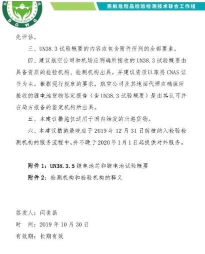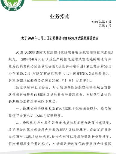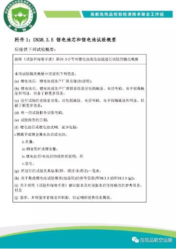 2019-2020版國際民航組織《危險(xiǎn)物品安全航空運(yùn)輸技術(shù)細(xì)則》規(guī)定,2003年6月30日以后生產(chǎn)的鋰電池芯或者鋰電池的制造商和隨后的銷售商必須提供聯(lián)合國《試驗(yàn)和標(biāo)準(zhǔn)手冊》第三部分第38.3小節(jié)第38.3.5段規(guī)定的試驗(yàn)概要(以下簡稱UN38.3試驗(yàn)概要)。